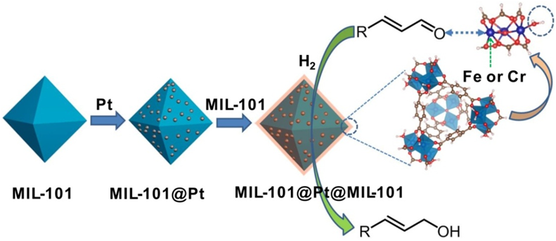 显然,如何有效地实现C=O双键活化和降低其加氢反应的能垒是该课题尚待解决的关键科学问题之一。基于MOFs具有大的比表面积和规整的孔道结构,有利于底物和产物分子的扩散和传输。更为重要的是,MOFs中含有丰富的配位不饱和金属位点,这些金属位点不但易于调换,而且可以作为路易斯酸(Lewis acid)与C=O双键中氧原子的孤对电子相互作用,从而弱化C=O双键的键能,促进不饱和醇的生成。唐智勇团队提出用MOFs作为选择性加氢反应的调控器,同时巧妙地设计和精准构筑了三明治结构MIL-101@Pt@MIL-101催化剂,其特点如下:(1)铂纳米粒子被MOFs包覆,即铂表面具有均一催化位点,易于实现定向催化。(2)MOFs中配位不饱和金属位点作为路易斯酸与C=O双键作用,弱化其键能,提高其加氢收率;同时金属位点可调换(Fe、Cr)。(3)外壳层厚度可调,具有丰富的孔结构,有利于扩散和输运。催化实验结果表明,相对于单一铂纳米粒子和负载型催化剂,三明治结构催化剂可以显著提高肉桂醇的选择性(~95.6%),同时可实现底物肉桂醛的高转化率(~99.8%),而且也展现了很好的催化稳定性。进一步的实验和理论计算表明,MIL-101中配位不饱和金属位点Fe和Cr与肉桂醛中C=O双键相互作用,且与不饱和Fe位点具有较强的作用,从而弱化C=O双键;同时铂原子活化氢气,促进不饱和醇的生成,且与不饱和Fe位点协同作用更易于实现C=O双键的定向催化。为了进一步证实上述催化理念,选择了具有较小尺寸的α,β-不饱和醛(丙烯醛、3-甲基-丁烯醛和糠醛)作为底物分子,三明治结构复合催化剂也展现出很好的C=O双键选择性加氢性能。同时,还设计了具有不同配位不饱和金属位点的MOFs来构筑三明治结构催化剂,如MOF-525(Zr)、MOF-74(Co)、UiO-66(Zr)和UiO-67(Zr),它们在催化肉桂醛选择性加氢制备肉桂醇中也展现了很好的性能。显然,这种铂纳米粒子与MOFs中配位不饱和金属位点协同催化α,β-不饱和醛中热力学不优越的C=O双键加氢制备不饱和醇的催化剂设计理念,具有一定的普适性。该研究提出了以MOFs取代传统的金属氧化物作为新一代的载体材料,为负载型催化剂的结构设计和制备提供新思路;同时也为一些具有重要工业应用和挑战性的催化难题的解决提供重要借鉴。