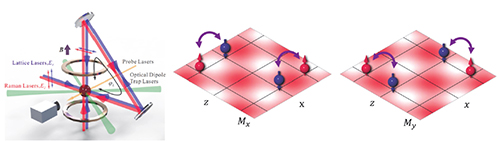 二维自旋轨道耦合和拓扑能带实现示意图。在激光场作用下,原子在光晶格中发生自旋翻转的量子隧穿,导致自旋轨道耦合。