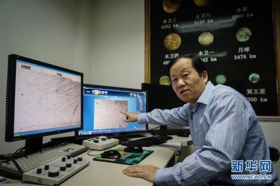 10月13日,中科院紫金山天文台天体化学与行星科学实验室首席科学家徐伟彪在实验室,向记者介绍2011年在新疆阿勒泰小东沟地区发现的5吨重特大铁陨石乌希里克切片的内部岩石结构和矿物化学成分。