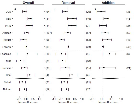 图1.陆地生态系统氮循环变量对积雪厚度增加分别在减雪、加雪以及所有实验类型中的响应