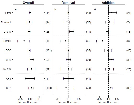 关于氮循环对积雪变化响应的文章以Response of terrestrial nitrogen dynamics to snow cover change: A meta-analysis of experimental manipulation 为题已正式发表于土壤学类期刊《土壤生物学与生物化学》(Soil Biology and Biochemistry, 2016, 100, 51-58);关于碳循环对积雪变化响应的文章以Response of terrestrial carbon dynamics to snow cover change: A meta-analysis of experimental manipulation (II)为题已正式发表于土壤学类期刊《土壤生物学与生物化学》(Soil Biology and Biochemistry, 2016, 103, 388-393