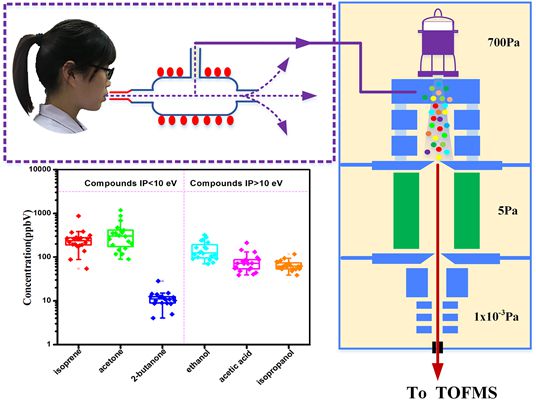 李海洋研究团队利用高气压下的真空紫外灯(VUV)光电离结合飞行时间质谱技术(HPPI-TOFMS)分析人体呼出气,在1分钟的采样时间内实现了对人体呼出气中丙酮、异戊二烯、二甲基硫、乙醇、乙酸等物质的高灵敏检测。在100%相对湿度条件下,该方法能够实现浓度低至几十pptV挥发性有机物(VOCs)的直接在线检测,且对苯系物、呋喃类、含硫和含氮化合物具有超高的灵敏度和选择性,这在污染暴露分析、职业病防治等领域具有重要的应用前景。相对于其它呼出气检测方法,该技术的最大优势在于受湿度干扰小,特别是针对相对湿度高达100%的呼出气检测这一大难点,成功消除了各种除湿方法不可避免会造成衡量待测物损失的不足。