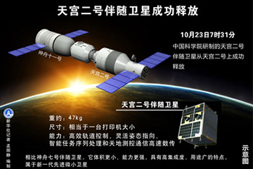 由中国科学院研制的天宫二号伴随卫星于9月15日随天宫二号空间实验室发射入轨,经过约40天在轨贮存,于10月23日7时31分从天宫二号上成功释放。在释放过程中,航天员景海鹏和陈冬利用手持摄像机从舱内拍摄到了伴随卫星从天宫二号下方百米之外掠过的视频。