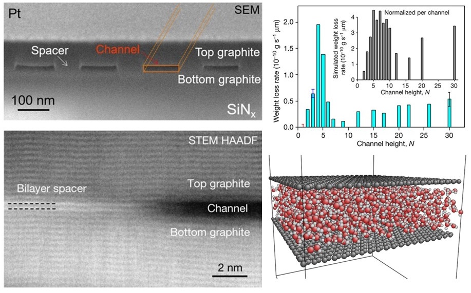 图:石墨烯纳米通道;实验及模拟中观测到的纳米尺度水传输的尺寸效应;分子模拟中水在该纳米通道中的流动。