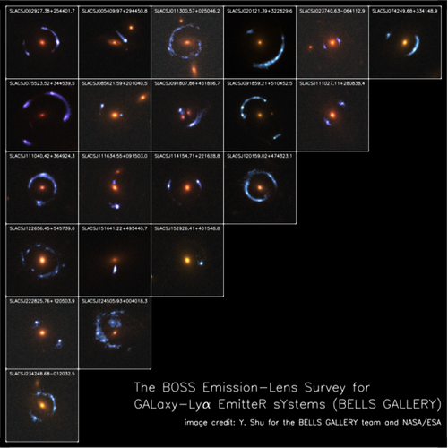 为了获得更高的质量灵敏度,国家天文台的舒轶平等首先通过对近一百万条星系光谱的分析,挑选出21个强引力透镜候选者,其中的背景天体都是红移2到3的莱曼alpha发射体。与现有的强引力透镜样本相比,莱曼alpha发射体的本征尺寸小3到5倍,从而能将质量灵敏度提高1个数量级左右。之后,舒轶平和美国犹他大学教授Adam Bolton等利用哈勃望远镜对这一样本进行后续观测,21个候选者中的17个被证认为强引力透镜系统(如图所示)。通过对哈勃望远镜数据的研究,舒轶平及其合作者发现背景的莱曼alpha发射体一般由多个成分构成,是目前发现背景星系尺度最小的样本,为更深刻揭示小质量暗晕和暗物质本质提供了极佳基础。