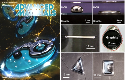 图1 期刊封面故事及液态金属在石墨表面的自由铺展与塑形效应
