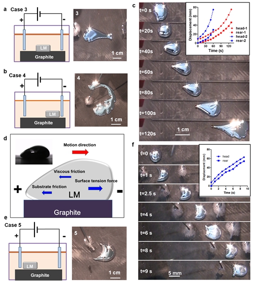 进一步地,基于石墨表面的液态金属自由塑形效应,研究人员探索了电场作用下液态金属不同于传统基底材料如塑料、玻璃等情形的丰富的物理化学图景(图2),初步揭示了其独特的变形及匍匐运动行为的内在机制。有趣的是,作者们还首次揭示出处于自由空间下的电控液态金属的蠕动爬坡能力,实现了逆重力方式的运动(图3);而采用常规材料,液态金属会因自身重力较大且表面光滑难以攀爬的缘故,不易通过外电场实现逆重力牵引。新发现扩展了近年来兴起的液态金属柔性机器的理论与技术内涵。