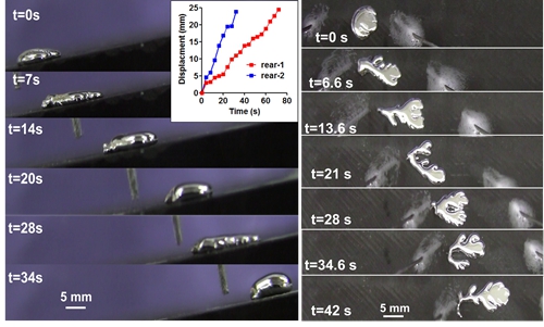 图3 电控液态金属以蠕动变形方式在石墨斜坡上逆重力攀爬的情形(侧视及俯视图)