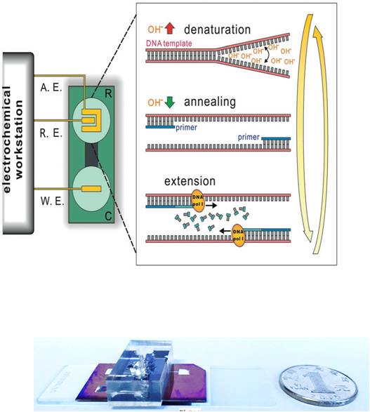 PCR是体外通过酶反应合成、高灵敏扩增目标基因片段的一种方法,是最常用的分子生物学技术之一。常规PCR是通过控制溶液温度来实现DNA分子的可逆变复性,从而达到复制扩增的目的。而这种升降温过程通常需要复杂的控温装置并消耗大量能源。从理论上来说,DNA变复性还可以通过酸碱变性来实现,然而如何在不改变溶液体积的情况下精确控制溶液pH值则是一个难题。上海应物所物理生物学研究室樊春海课题组与清华大学化学系刘冬生课题组合作,建立了一种基于微流控的电化学芯片,可以通过电压驱动快速、精确调控溶液pH值,并实现了对DNA分子机器的电驱动控制(Nano Lett. 2010,10,1393)。基于这一研究基础,上海应物所博士张一和副研究员李茜发现微流控电化学可以有效控制PCR反应体系的pH值,实现了室温下的酸碱驱动的IM-PCR扩增。与传统PCR技术相比,这一新型的集成化IM-PCR技术无需变温过程,所有反应步骤均在室温下进行。这一小型化、低成本、易于集成的PCR新技术有望在生物检测、临床诊断及环境监测中发挥作用。