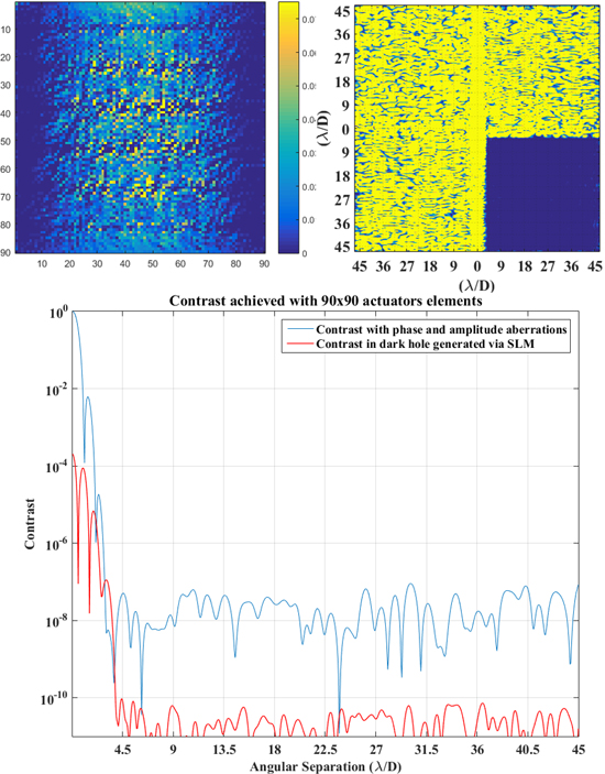 图1. 超高对比度成像系统理论模拟结果。上图:由相位校正单元提供的波像差(左),产生的大区域高对比度成像暗区(右);下图:成像对比度曲线(蓝色——散斑噪声占主导情况下系统成像对比度~10-7,红色——经过SLM校正之后在大工作区域内4~45λ/D获得高达100亿倍的成像对比度)。