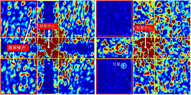 图2. 超高对比度成像系统实验结果:未经过星冕仪校正,行星淹没在恒星散斑噪声之中(左);经过星冕仪精确校正之后,由系统静态波相差产生的散斑噪声被有效消除,使得较恒星光暗109倍的行星(白色圆圈内)清晰可见(右)。