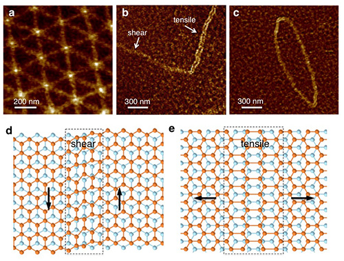 图2.(a)-(c)双层石墨烯中丰富多彩的畴壁结构;(d)-(e)两种极限畴壁shear和tensile的微观结构示意图。