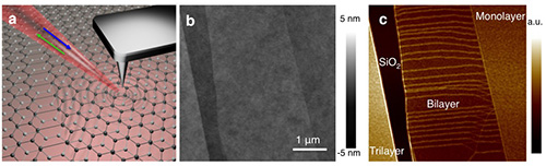 图1.利用近场红外纳米成像技术对双层石墨烯中的畴壁进行成像。(a)近场红外纳米成像技术示意图;(b)双层石墨烯AFM高度图;(c)相应的近场光学图像。