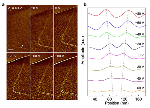 图3.(a)栅极电压对shear和tensile两种畴壁处等离激元反射行为的调制作用;(b)不同栅极电压下沿着图(a)白色虚线处的轮廓线。