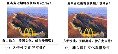 该研究使用了一组麦当劳将在长城开设分店的广告作为文化混搭的材料。广告中有一张麦当劳的logo压在长城的图片,以及一则广告语。入侵性文化混搭条件下的广告语为“自由独立,美国文化,就在麦当劳!”而非入侵性文化混搭条件下的广告语为“方便快捷,无限美味,就在麦当劳!”另外设置了一个控制组,不观看任何广告。观看完材料后,参与者需要完成简式内隐联系测验(BIAT,Sriram & Greenwald, 2009),测量他们对于美国的内隐态度。