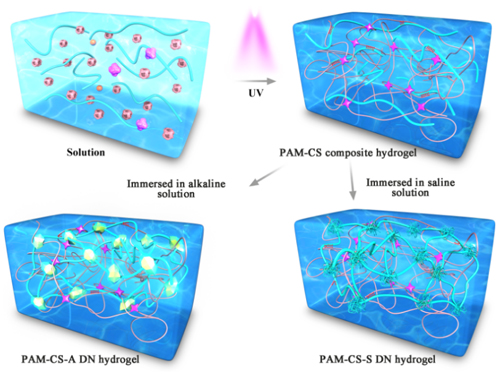 图:将复合水凝胶转变为物理-化学交联双网络水凝胶的转变机制