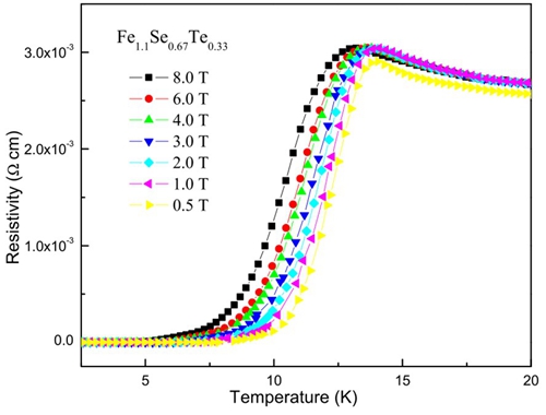 图2. 燃烧合成制备的FeSe1-xTex铁基超导材料,超导转变温度为14 K@临界磁场强度54 T