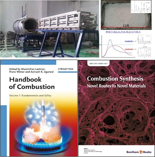 图4. 大型燃烧合成装备、可实现的两种燃烧反应模式,以及应邀参与撰写的两部专著