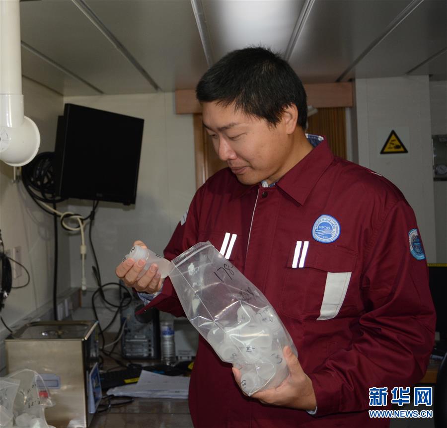 航次首席科学家汪嘉宁在查看本航次中采集到的水样(2017年1月2日摄)。新华社记者张旭东摄