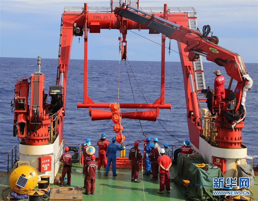 科考队员在进行深海潜标主浮球和声学多普勒流速剖面仪的回收(2016月12月22日摄)。新华社发