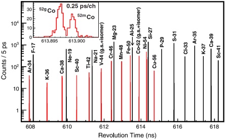 近代物理所科研人员首次运用CSRe直线段上的狭缝限制了储存环中离子的发射度,使等时性质量谱仪的分辨能力提高了两倍,从而在飞行时间谱上清楚地区分了52Co的基态及其同核异能态(见图)。实验测得52Co同核异能态的激发能仅为387(13)keV,其质量相对精度σm/m达到了1.6*10-7,是目前国际同类装置测量的最高水平。