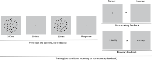 图1:两组被试进行视觉运动辨别任务流程。前测时两组都没有任何反馈,测得阈限作为基线。训练时金钱强化组进行金钱反馈,非金钱组进行一般对错反馈。