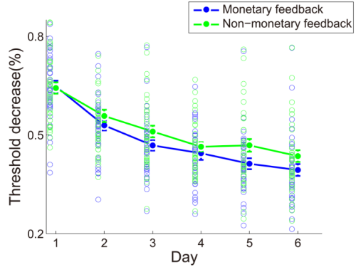 图2:金钱和非金钱组在训练六天中测得阈限相对前测阈限降低的比例。