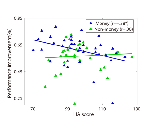 研究者同时测查了被试的强化敏感性,包括奖赏依赖和伤害回避两种人格维度。结果发现:1)金钱组视知觉学习效果比非金钱组略好(图2);2)金钱组被试的伤害回避得分与知觉学习效果成反比,即伤害回避得分越低,知觉学习成绩提高越多(阈限降低越多),而非金钱组不存在这种关系(图3);3)不论是金钱组还是非金钱组,奖赏依赖与视知觉学习效果无关。