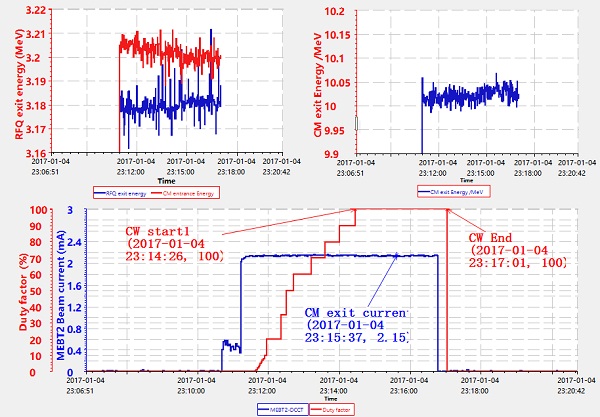 ADS质子直线加速器注入器I于2016年12月28日获得了能量为9.15MeV,平均流强为2.2mA的CW质子束;2017年元旦期间调束及硬件系统人员一鼓作气,1月4日夜间再次在超导段出口获得能量为10 MeV,平均流强为2.1mA的CW质子束,可以稳定运行。
