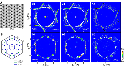 图1. Ag(111)衬底上生长的(3x3)硅烯的扫描隧道显微像(A)和电子结构(D)。作为对比,(C)显示了纯Ag(111)的电子结构。