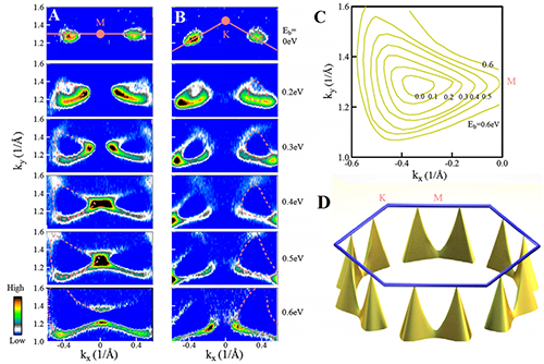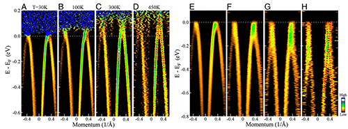 图4. 采用高温测量(A-D)和表面蒸钾(E-H)的方法,探测硅烯狄拉克锥的上锥结构。