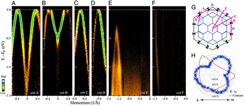 图3. 硅烯的能带结构(A-F)及费米速度的各向异性(H)。