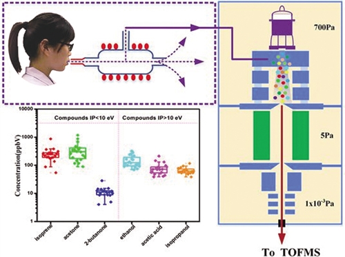 李海洋团队利用高气压下的真空紫外灯光电离结合飞行时间质谱技术(HPPI-TOFMS)分析人体呼出气,在1分钟的采样时间内,实现了对人体呼出气中丙酮、乙醇、乙酸等物质的高灵敏检测,这在污染暴露分析、职业病防治等领域具有重要的应用前景。