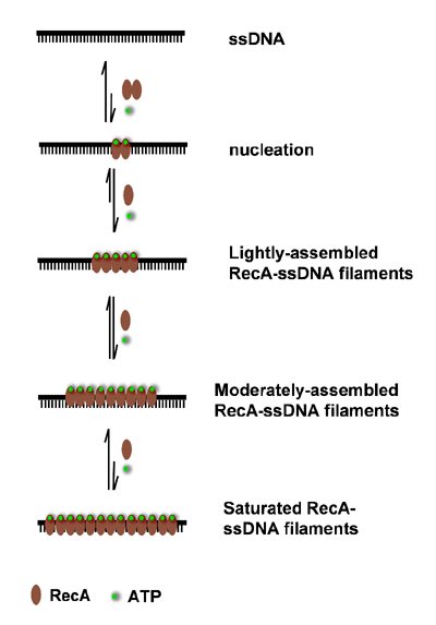 RecA利用其本身ATP酶水解活性紧密调控RecA在ssDNA上的组装,进而形成多种组装体结构,包括饱和、高密度核蛋白丝、中密度和低密度的不饱和核蛋白丝