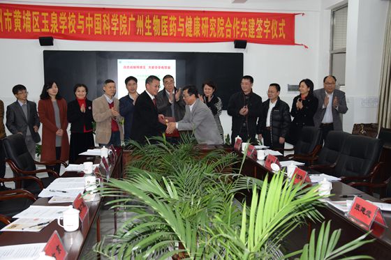 广州市黄埔区玉泉学校是一所新建的九年一贯制公立学校,以“中国灵魂、国际视野、科技创新、人文素养”为发展目标,占地面积120亩,建筑面积6.8万平方米,规模设置为60个教学班。根据协议,双方将遵循“公平诚信、互惠互利、优势互补、互动双赢”的原则,共建示范基地。广州生物院为玉泉学校开展外语拓展辅导、科技创新辅导、科学家进班级、博士辅导课堂、科学实验体验等活动提供人员支持,增强学生创新能力,促进学校教学和人才培养;玉泉学校为中科院职工子女在其学校就读给予支持。