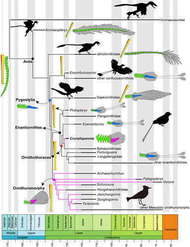 2月1日,中国科学院古脊椎动物与古人类研究所王敏、周忠和、邹晶梅,与南京地质古生物研究所泮燕红在《自然—通讯》(Nature Communications)上报道了一件发现于1.3亿年前的早白垩世反鸟类——多齿胫羽鸟(Cruralispennia multidonta),揭示了尾综骨与尾羽在鸟类早期演化中是相互独立的,此外还发现了一类形态特殊的羽毛。