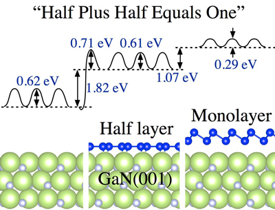 值得指出的是,这一“半层-半层”的新颖生长机理,从本质上有异于该团队以前所发现的占主导地位的单层石墨烯外延生长机理,有效地扩展了人们对不同范德瓦尔斯体系非平衡生长现象的认知。此外,在此工作审稿期间,已有实验在Au(111)衬底上生长出接近完整的单层蓝磷。而在半导体GaN(001)衬底上生长出蓝磷或蓝磷单层,由于可以直接用于器件探讨,有其更诱人的基础与应用前景。