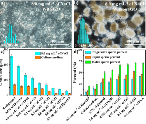 他们也首次将GO应用于低温冷冻保存细胞。当选用GO作为冷冻保存剂时,与商业化的抗冻剂相比,GO展现出了非常优异的冷冻保存效果,加入0.01 wt%的GO即可将马精子活力从24.3%提高到71.3%(图2)。这一研究发现不但拓展了二维材料的应用领域,而且大大加深了人们对冰晶形成分子层面的理解。该工作发表在《德国应用化学》上(Angew. Chem. Int. Ed. 2017, 56, 997 –1001)。