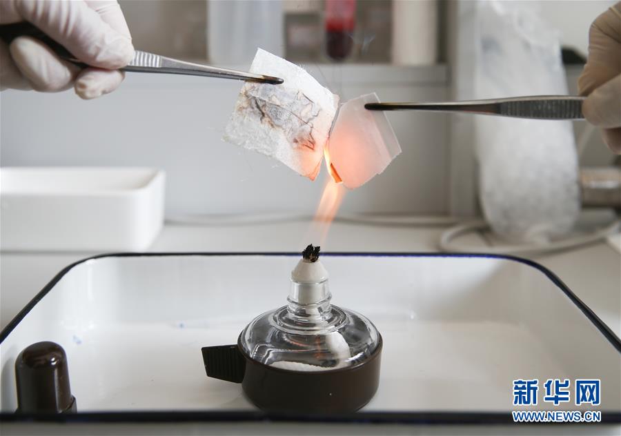 科研人员在实验室内对比展示柔性耐火织物的防火特性(2月14日摄)。左侧的柔性耐火织物完好无损,而右侧的普通织物被点燃。新华社记者 丁汀 摄
