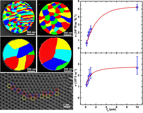 最近,中国科学院金属研究所沈阳材料科学国家(联合)实验室先进炭材料研究部石墨烯研究组采用溶碳量适中的金属铂片作为生长基体,发展出一种基于“析出-表面吸附生长”原理的CVD方法,仅通过改变析出温度便实现了对石墨烯形核密度的控制,制备出晶粒尺寸在~200 纳米到~1 微米范围内均一可调、且晶界完美拼合的高质量单层多晶石墨烯薄膜。在此基础上,获得了晶粒尺寸对多晶石墨烯的电导率和热导率的影响规律及晶界电阻率(~0.3 kW·µm)和晶界热导(~3.8×109 Wm-2K-1),发现减小晶粒尺寸可导致热导率的显著降低但对电导率的影响较小。根据该影响规律推算,当石墨烯的晶粒尺寸从1毫米减小到5纳米时,其热导率的衰减幅度可达300倍,而电导率的衰减仅为10倍左右,并且热导率和电导率随晶粒尺寸变化的变化率高于典型的半导体热电材料。