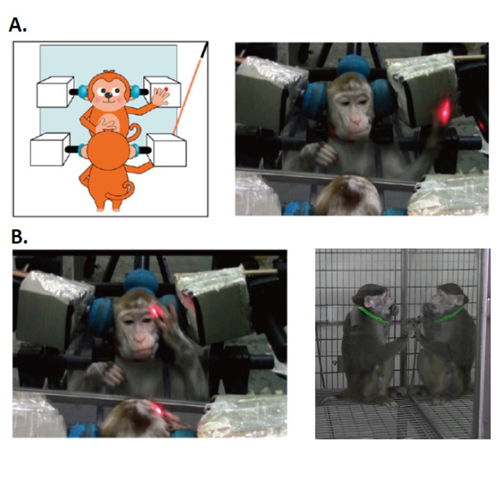 图注:A.视觉-本体位置偶联训练; B. 恒河猴镜像自我识别能力