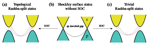 图1:Shockley表面态出现在晶体场导致的sp能带反转能隙中(b)。当引入自旋-轨道耦合,演化成具有Rashba劈裂的拓扑非平庸(a)或者平庸(c)的表面态。