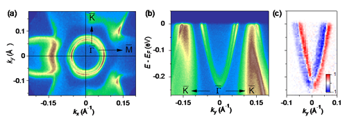 图2:(a)As(111)面布里渊区中心附近费米面强度图,显示出Rashba劈裂的表面态形成两个同心圆型的费米面。(b)表面态能带具有Rashba劈裂的近自由电子形式的色散。(c)Rashba劈裂表面态能带具有自旋极化。