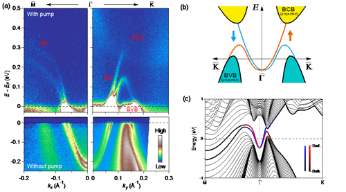 图3:(a)利用泵浦技术测量未占据态的电子结构(上半部分)。(b)沿\(\bar{\Gamma}-\bar{K}\) 方向能带拓扑的示意图。(c)第一性原理计算高度复现实验结果。