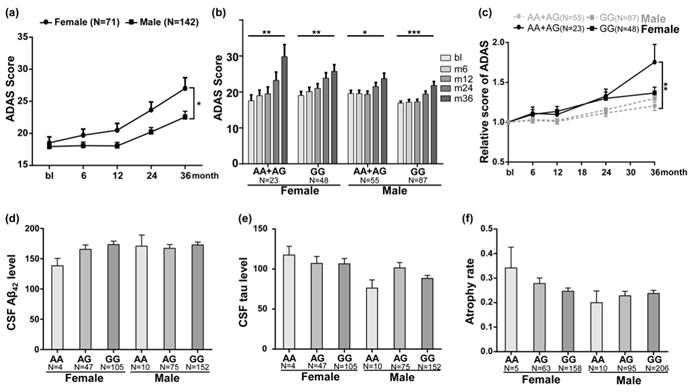 AD的发生有一定的性别偏好,女性患者数量多于男性患者,但其中具体机制目前仍然不是很清楚。脑源性神经营养因子BDNF是一个受到雌激素调控的神经营养因子,在AD的致病通路中发挥重要作用,然而前期针对BDNF基因与AD遗传相关性的研究并没有得到一致的结果。昆明动物所硕士研究生李国栋等在姚永刚的指导下,对我国汉族AD人群的BDNF基因开展了遗传关联分析。病例对照分析发现,BDNF基因变异rs6265在女性中与AD遗传易感相关,这一结果也在来自世界各地病例对照人群的荟萃分析中得到验证。并且,rs6265风险变异的女性携带者认知能力下降速度显著高于非携带者以及男性携带者;而在男性中没有观察到这种rs6265变异与认知能力下降的关联现象(图1)。以上研究结果进一步揭示了AD发病性别偏好的潜在遗传机制,近期发表于《老年神经生物学》(Neurobiology of Aging)期刊。