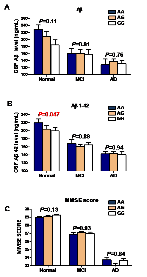 AD的一个主要症状是记忆丢失。神经元内有非常复杂的信号通路,调控记忆的形成和储存,包括Arc基因在内的即刻早期基因家族,是维持学习记忆通路正常功能和记忆巩固的重要因素。然而,这些即刻早期基因与AD的遗传相关性研究还比较少。昆明动物所博士毕蕊和硕士研究生孔莉莉等在姚永刚的指导下,对我国汉族人群Arc基因与AD的相关性开展了系列研究。发现位于Arc 3’UTR区的位点rs10097505-AA与AD遗传易感相关,且该风险基因型与上调的Arc表达水平相关,这一结果也得到了双荧光素酶报告实验的验证。结合遗传分析数据和AD生物标记物数据分析发现,rs10097505-AA与Aβ水平上调相关(图2)。对表现高遗传力,如有家族史或发病年龄早于55岁的AD患者Arc基因的外显子区稀有变异进行分析发现,非同义变异c.20G>A(p.T7I)在AD患者中的频率显著高于对照人群,并且在包含2854例的我国普通人群以及4327例的东亚人群中均没有发现该变异。该变异改变了Arc蛋白高度保守的第7位氨基酸,潜在影响蛋白结构,致病性预测分析显示具有高致病性。以上研究结果提示,Arc基因的常见变异和稀有变异可能通过影响Arc表达或蛋白结构,进而与AD遗传易感相关。论文近期在线发表于《分子神经生物学》(Molecular Neurobiology)期刊。