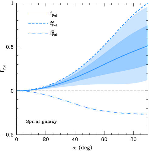 巩岩等人发现,对于星系团来说,由于其磁场分布不规则,很难确认其总的光子极化方向,因此不能通过其总极化方向和磁场来判断。但由于星系团体积巨大,可通过观测其某些部分发出的3.5 keV光子的极化方向,并与这些部分的磁场方向进行比较,来确认两者是否一致。对于漩涡星系,巩岩等人根据以往相关观测结果,建立了漩涡星系的磁场分布模型,并以此模型为基础,计算了总的3.5 keV光子极化度和极化方向与漩涡星系观测倾角的关系(如图2),从而可以凭借此关系来验证轴子转化假说。更广泛的,特别是对于不能确认倾角的漩涡星系,研究者也提出了检验方式。即由于漩涡星系盘面磁场往往强于星系晕中X形状磁场,所以对于大多数漩涡星系,如果发现总的3.5 keV光子极化方向平行于星系投影的长轴方向,也可以作为一种判断此假说正确的依据。