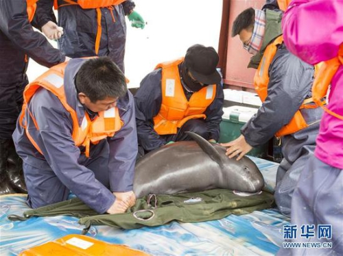 3月16日,中科院水生生物研究所工作人员在鄱阳湖都昌水域对江豚进行体检。新华社发(傅建斌 摄)