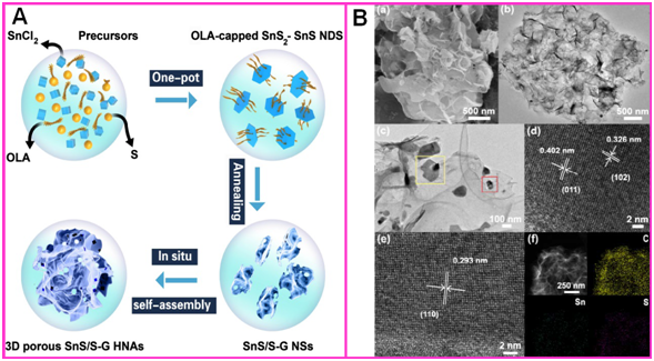 针对上述问题,王奇和韩敏课题组开展了合作研究,利用可控热转换油胺包裹的SnS2-SnS混相纳米盘前驱物的策略,巧妙地将有机分子的碳化、掺杂、相转换和自组装等重要的物理化学过程集成于一体,首次成功实现了硫掺杂石墨烯(S-G)和SnS杂化纳米片的原位合成与组装,得到了新颖的3D多孔SnS/S-G 杂化纳米建筑(HNAs,如图1所示)。相比传统合成策略,该方法具有简单高效、重现性好、可规模化制备等优点,为延伸和拓展掺杂石墨烯材料在清洁能源、光电和传感等重要技术领域的应用奠定了基础。在三电极体系中以KOH溶液作为电解液,所得3D石墨烯复合材料质量比电容高达642 F g-1 (电流密度为1 A g-1),远高于近来报道的石墨烯复合物和其他电活性材料(如体相和纳米级的SnS及其复合物、G-Mn3O4纳米棒、G-CoS2、2D CoS1.07/N- C纳米杂化体等)。