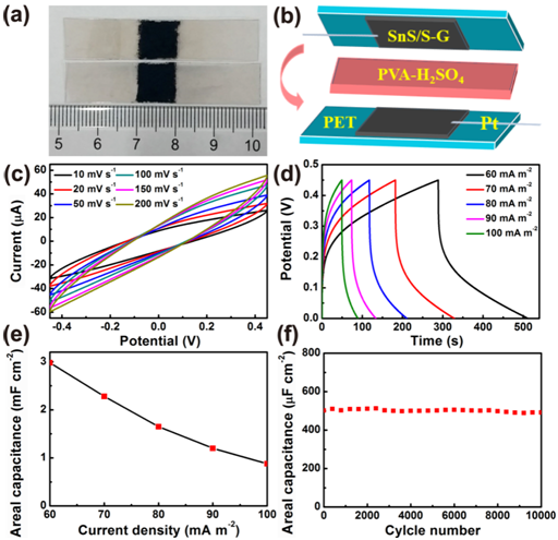 图2. 3D掺杂石墨烯基柔性全固态超级电容器的构建及性能测试